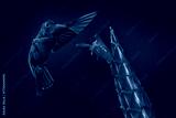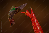 Rufous-tailed Hummingbird, Amazilia tzacatl, bird flying next to beautiful red rose flower in nature habitat with green background, bird from Costa Rica. Bird with yellow bloom. Costa Rica hummingbird