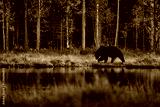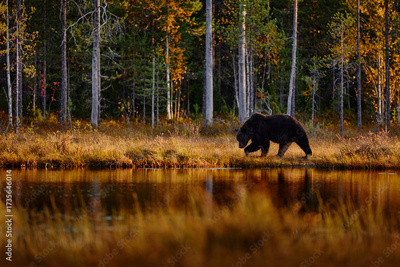 Sunset, evenig light with big brown bear walking around lake in the morning light. Dangerous animal in nature forest and meadow habitat. Wildlife scene from Finland near Russian border.