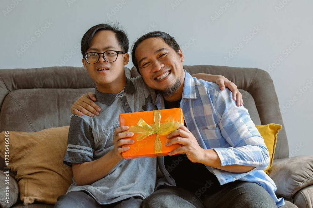 Portrait of Father and His Son with Special Needs Holding Present Box During Special Occasion