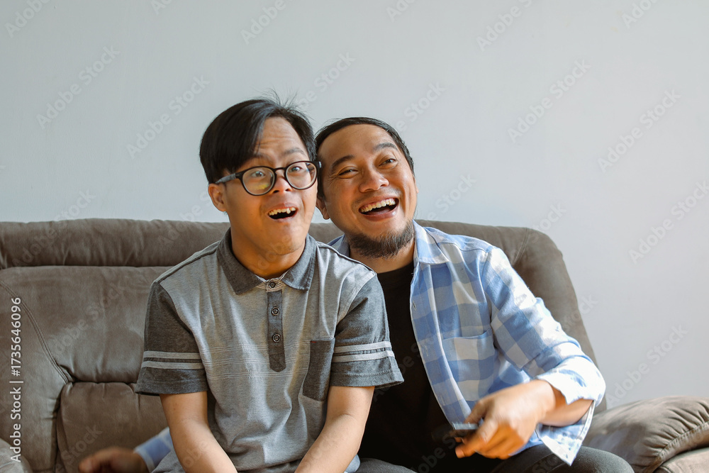 Happy Father and Son with Special Needs Laughing While Watching TV Together in Living Room