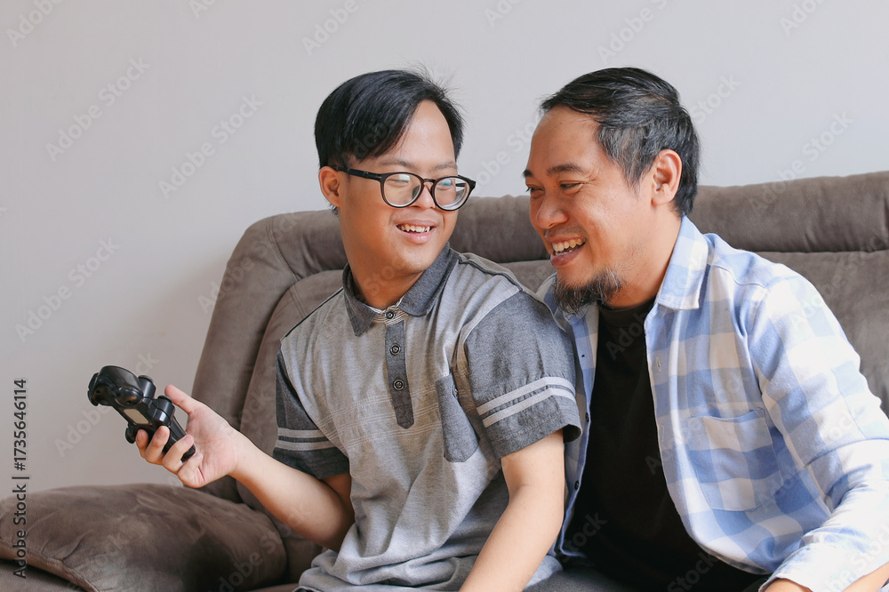 Happy Father and Son Enjoy Quality Time Gaming Together on a Couch