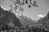 Snow mountain forest autumn leaves blue sky with clouds scenic view