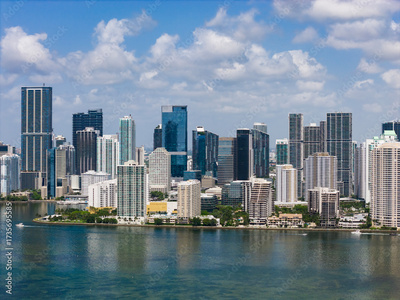 Aerial view of Brickell skyscrapers. Modern cityscape of downtown Miami. Panoramic Miami skyline above the coastline.