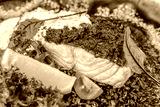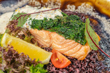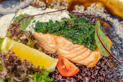 Close-up of grilled salmon fillet topped with spinach and creamy mustard sauce served with black rice, lemon, and fresh greens