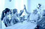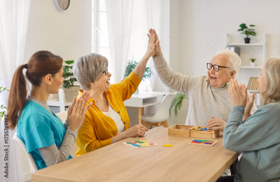 Cheerful elderly man and woman giving each other high five while playing jigsaw game at table. Smiling nurse and other senior woman applauding, celebrating victory and having fun in nursing home.