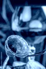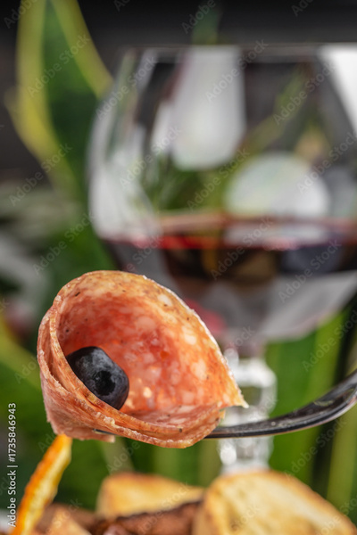 Close-up of a salami slice rolled with a black olive on a fork, with a glass of red wine in the background
