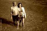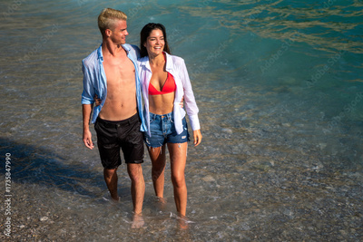 Happy young casual couple holding hands and walking at the beach, enjoying summer vacation
