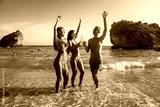 Group of young friends having fun at the beach with colorful drinks, laughing in the sun at summer