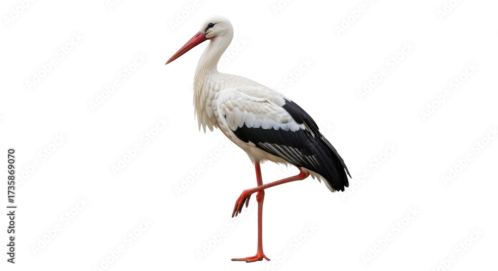 Isolated stork stands on one leg, showing off its long beak and black tipped wings