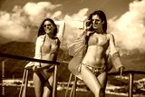Two women embracing freedom and nature on a yacht, lost in the moment, wind in their hair