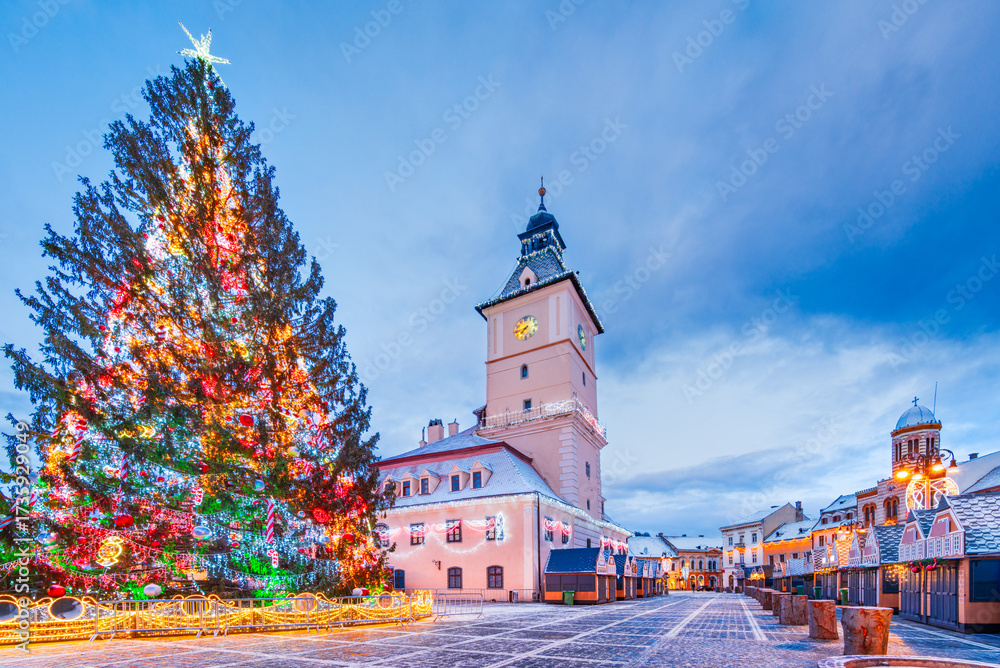 Brasov, Romania. Transylvania winter destination scenics with Christmas Market in the Main Square