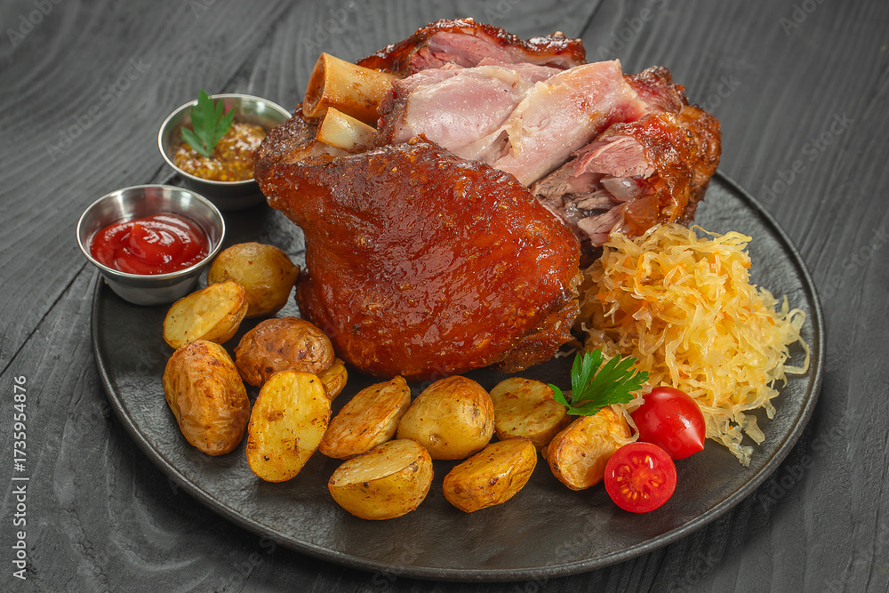 Juicy roasted pork knuckle served with golden baked potatoes, sauerkraut, cherry tomatoes, ketchup, and mustard on a black plate