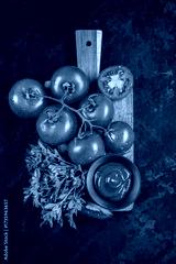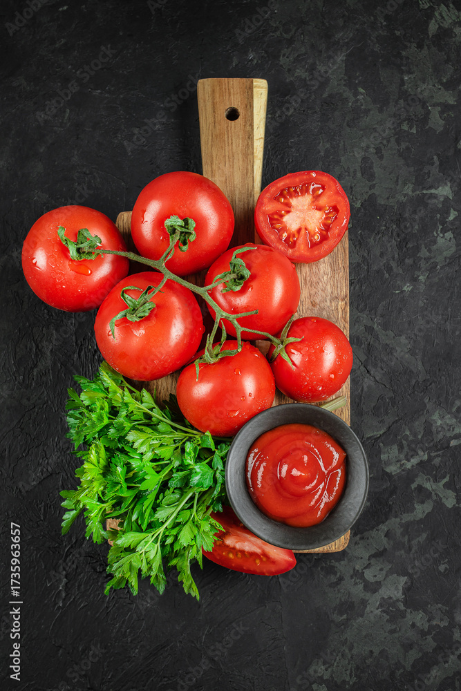 Top view of ripe tomatoes with parsley and a bowl of ketchup on a wooden board over dark background