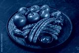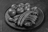 Closeup of grilled sausages served with fresh tomatoes, parsley and ketchup on a black plate