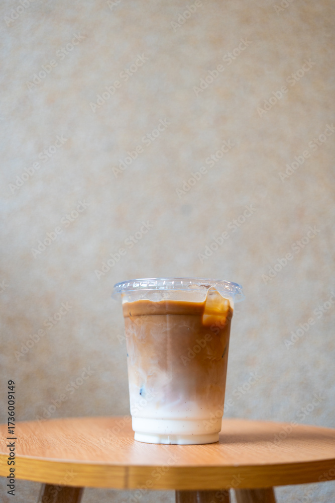 Clear plastic cup filled with ice latte on wood chair