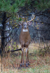White-tailed deer buck walking through the forest during the autumn rut in Canada