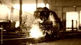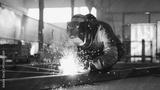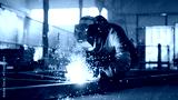 Welder wearing protective helmet and gloves performing arc welding on metal structure in a noisy industrial workshop, creating bright sparks and smoke