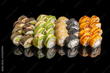 Variety of fresh sushi rolls with avocado, sesame seeds, nori, and sauces served on a reflective black surface