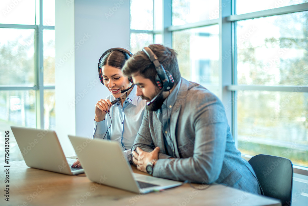 Man and woman call center agents collaborating on laptops while assisting clients with headsets