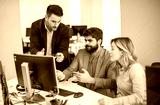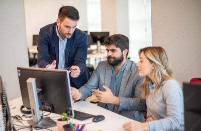 Business people collaborating at computer and discussing project during office meeting