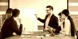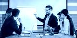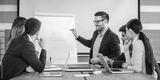 Business team leader presenting data analytics on whiteboard to engaged colleagues