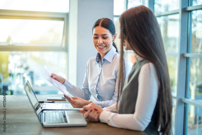 Female colleagues discussing business strategy while reviewing documents in bright modern office