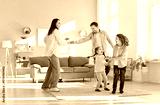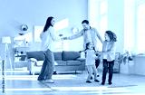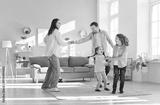 Funny active dancing family of young adult parents and cute small children together in modern living room interior, carefree little kids with mum, dad having fun laughing, enjoy leisure at home moving