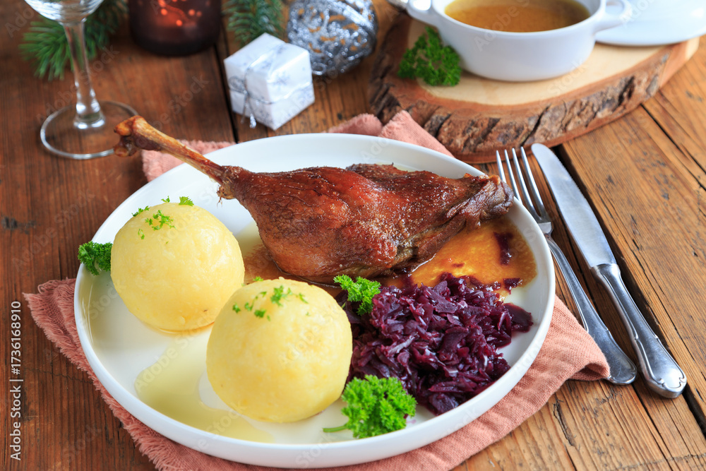 Entenkeule mit Rotkohl und Klößen