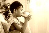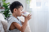 Asian boy drinking a glass of fresh milk at home. drinking milk with calcium, tasty and nutritious, promoting healthy lifestyle and balanced diet for children.