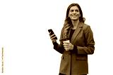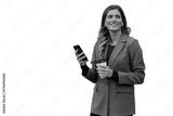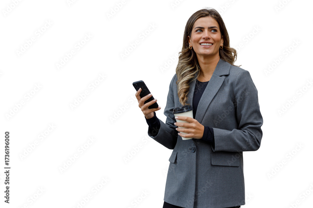 Businesswoman looking away, holding smartphone and coffee cup, smiling on transparent background
