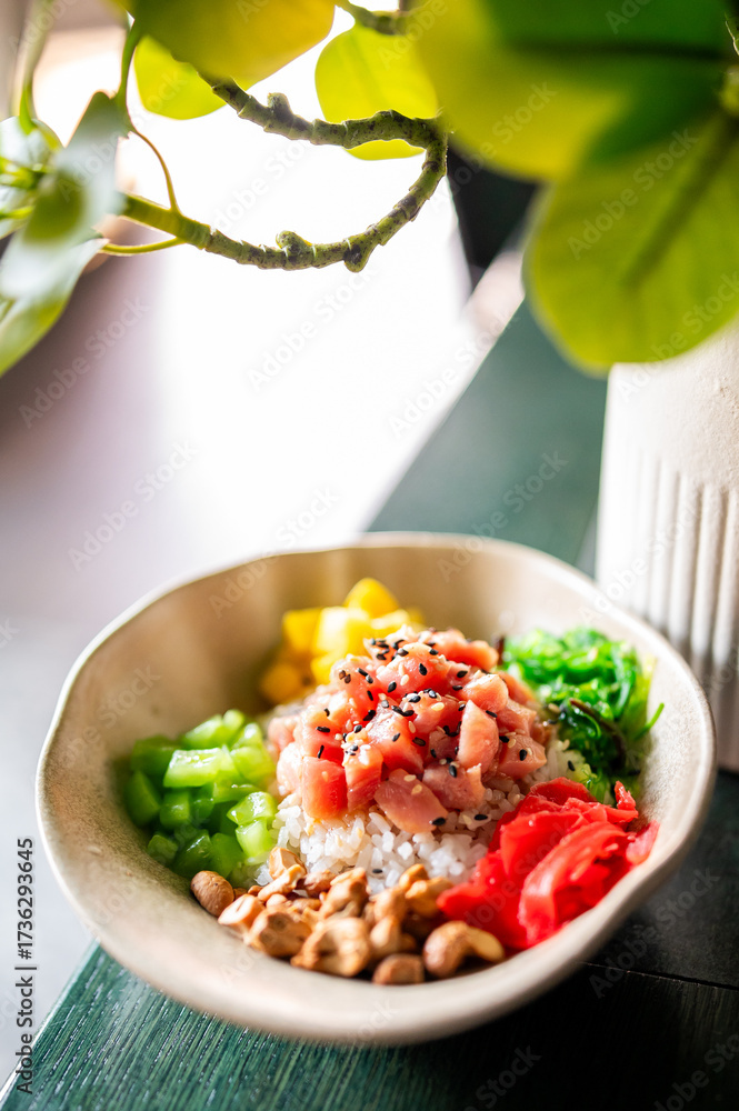 Colorful poke bowl with raw tuna, sesame seeds, seaweed salad, bell peppers, pickled ginger, nuts, and rice. Top-down view on green background with tropical decor