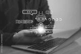 Businessman using smartphone with AI chatbot icon and digital message bubbles, symbolizing artificial intelligence, assistant, customer support automation, online communication, and smart technology.