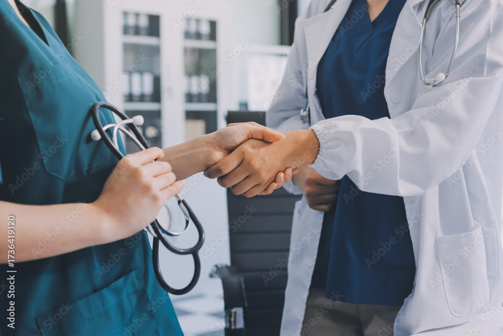 Medical team meeting analyzing blood test results in hospital laboratory. Doctors and scientists in lab coats are having a discussion about blood test result, holding test tubes and taking notes.