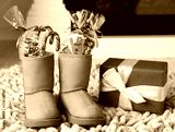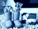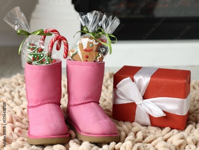 Saint Nicholas day tradition. Boots with sweets and gift box on floor indoors