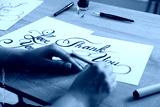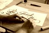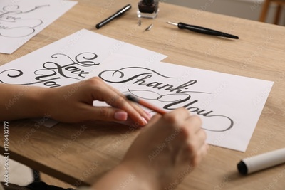 Calligraphy. Woman with brush writing words Thank You on sheet of paper at wooden table, closeup