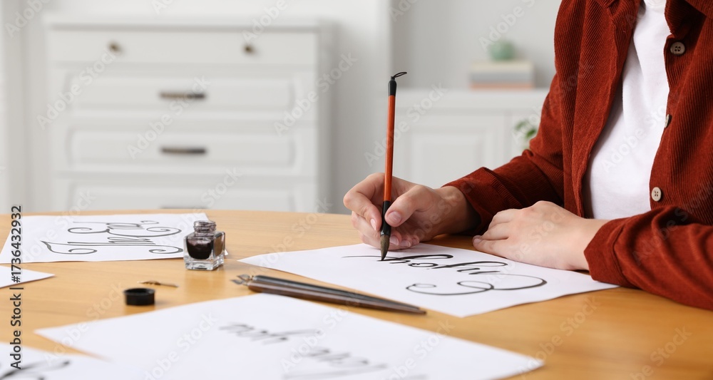 Calligraphy. Woman with brush writing word Enjoy on sheet of paper at wooden table, closeup