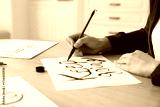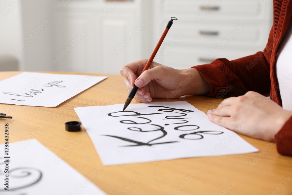 Calligraphy. Woman with brush writing phrase Keep Going on sheet of paper at wooden table indoors, closeup