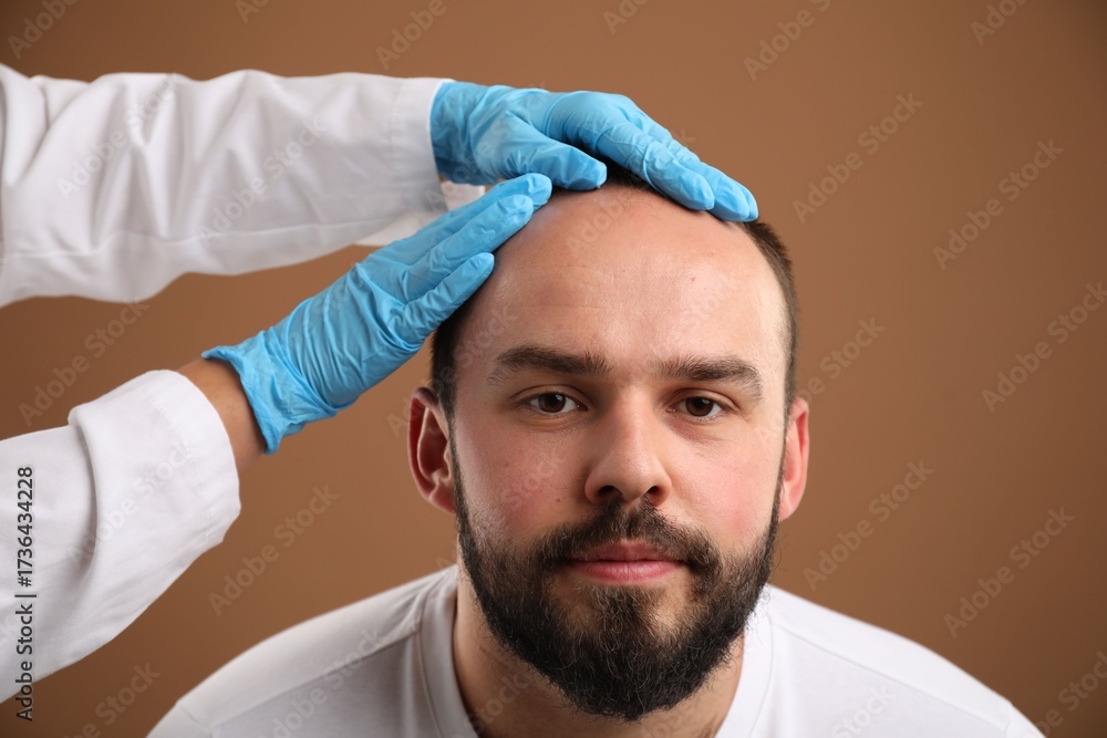 Baldness problem. Doctor in medical gloves examining patient's head against brown background, closeup