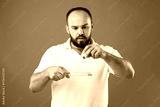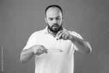 Baldness problem. Worried man taking his lost hair from brush on light blue background