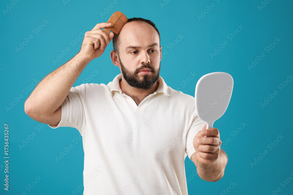 Baldness problem. Man brushing his hair with comb and looking at mirror on light blue background