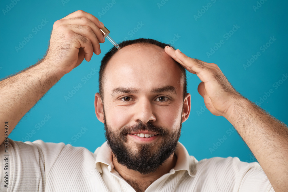 Baldness treatment. Smiling man applying serum onto his hair on light blue background