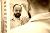 Baldness treatment. Man applying serum onto his hair near mirror at home