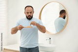 Baldness problem. Worried man taking his lost hair from brush near mirror in bathroom