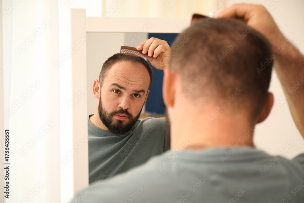 Baldness problem. Man brushing his hair with comb near mirror at home