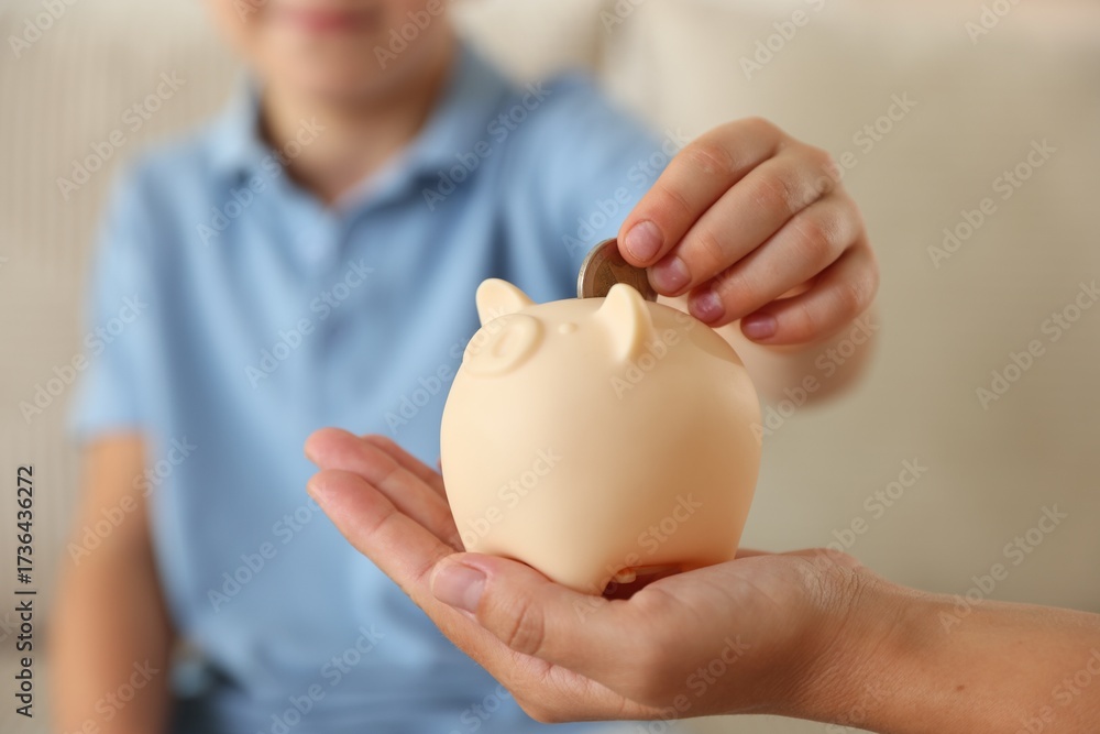 Mother and her son putting pocket money into piggy bank at home, closeup