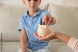 Mother and her son putting pocket money into piggy bank at home, closeup