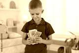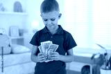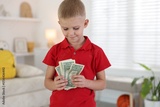 Little boy holding pocket money at home