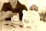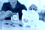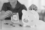 Little boy putting pocket money into piggy bank at white table indoors, closeup