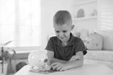 Little boy with pocket money and piggy bank at white table indoors