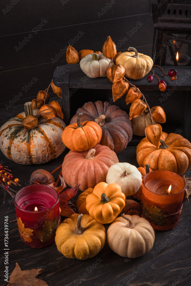 Still life with pumpkins and vintage lantern, Thanksgiving arrangement in autumn colors